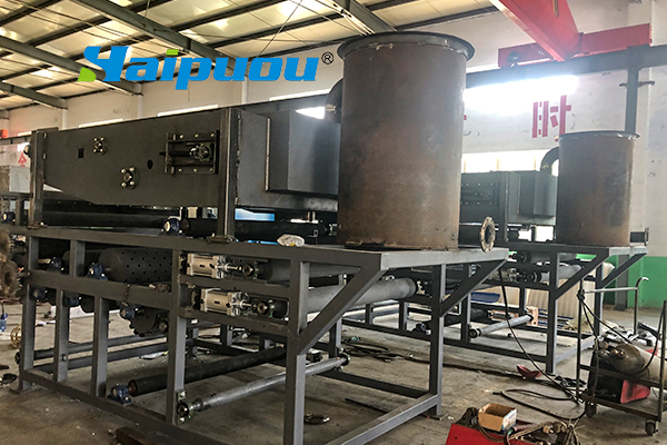 2、重力脫水段長,第一與第二重力脫水段總長5m多,使污泥在壓榨前充分脫水失去流動(dòng)性。同時(shí),重力脫水段還設(shè)置反轉(zhuǎn)等特殊機(jī)構(gòu),經(jīng)“楔”形、“S”形壓榨等作用使污泥濾餅獲得低的含水量。